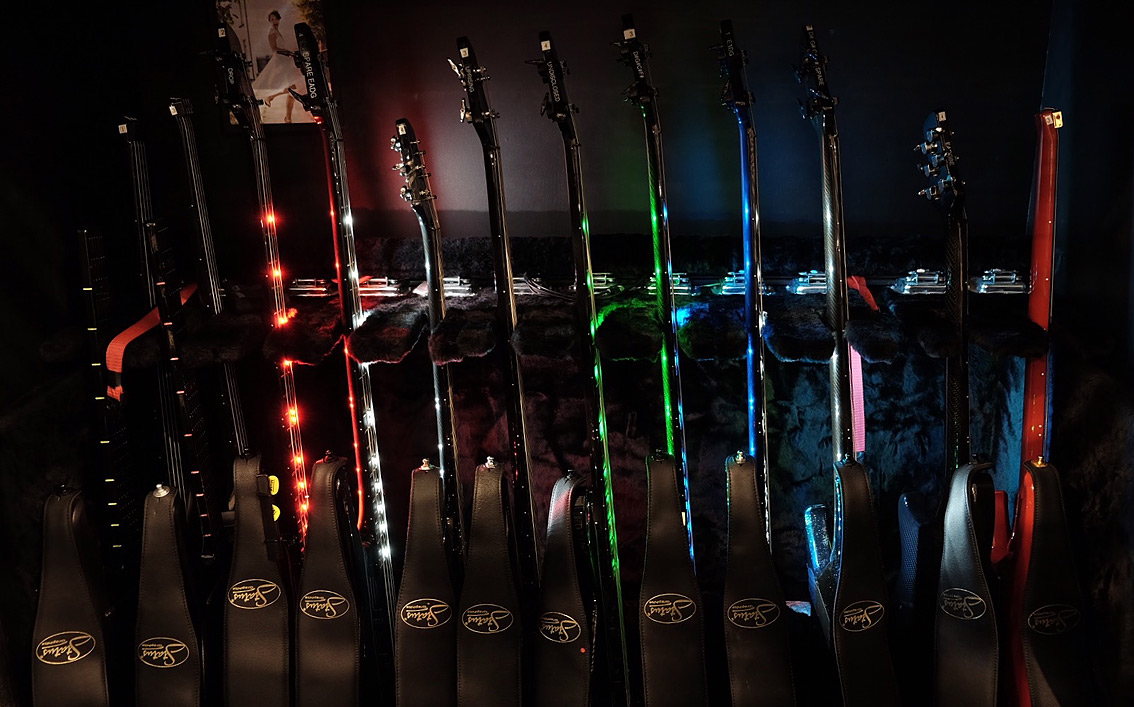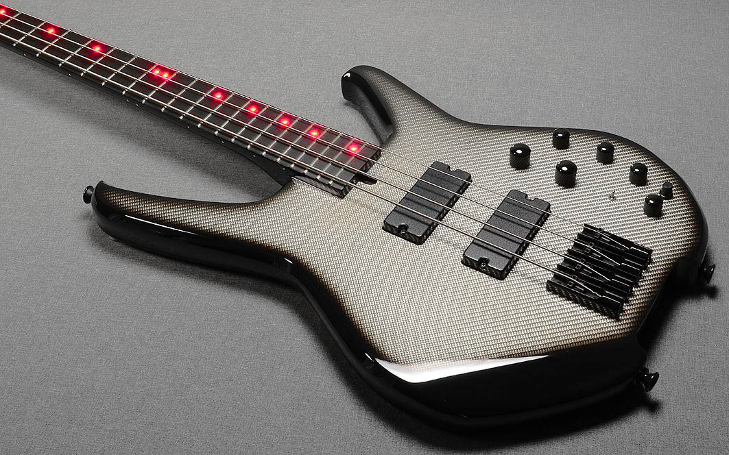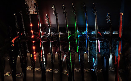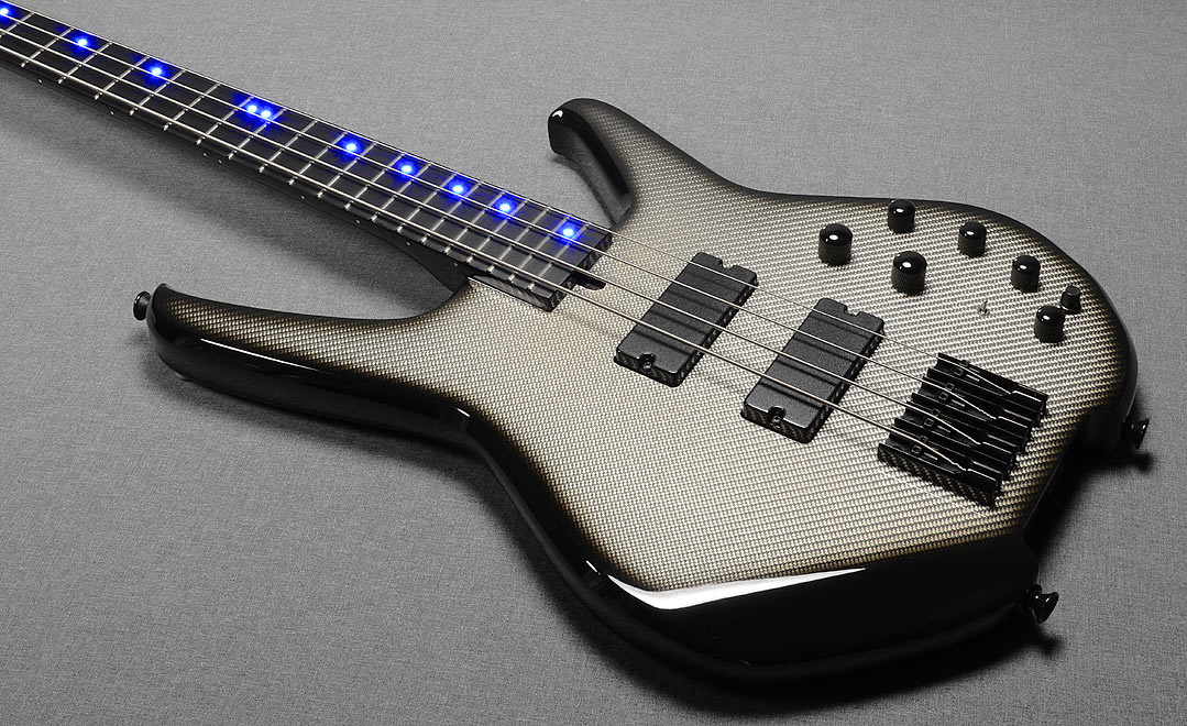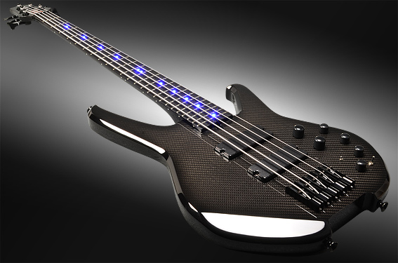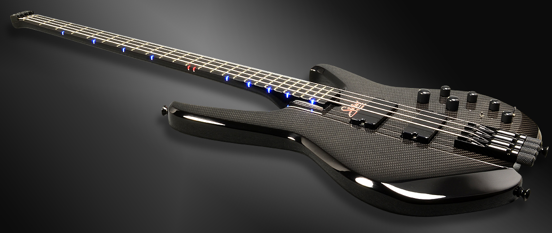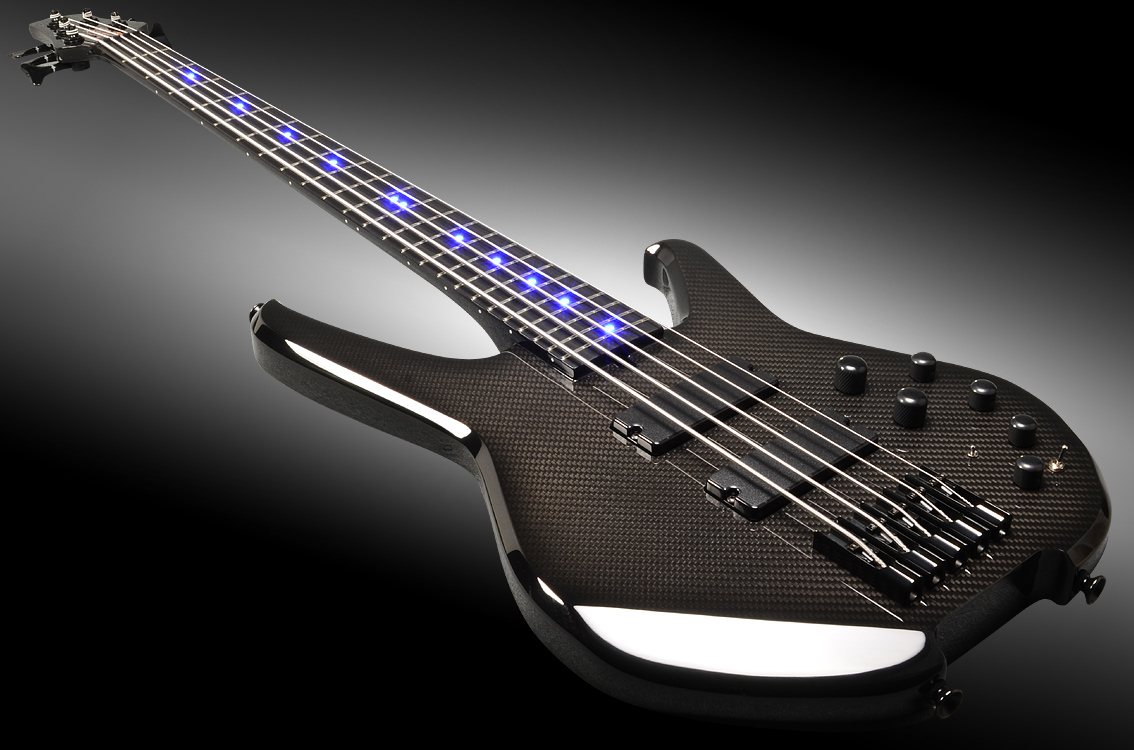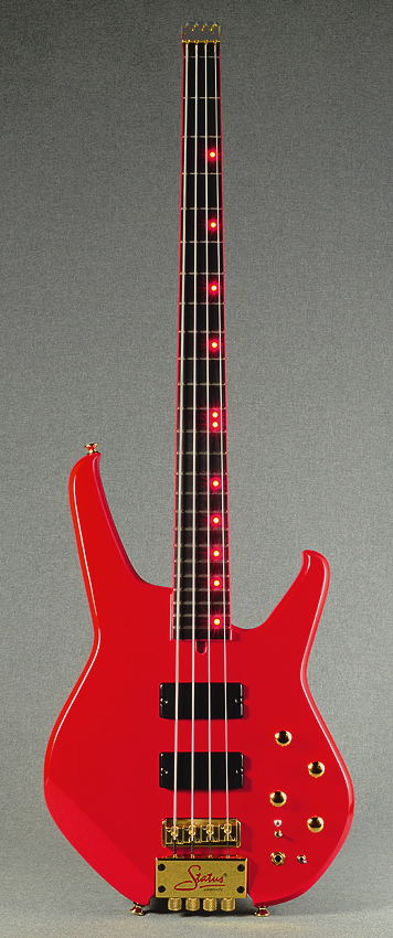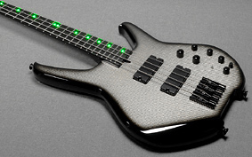 gives the tone a little more depth. 8 : Regular 34" (864mm) scale with 24 frets. 9 : Bridge string spacing = 19.0mm (0.75"). Top-nut width = 42.5mm (1.65") 10 : LEDs are a custom option. (Red, blue, green, white or amber). |
