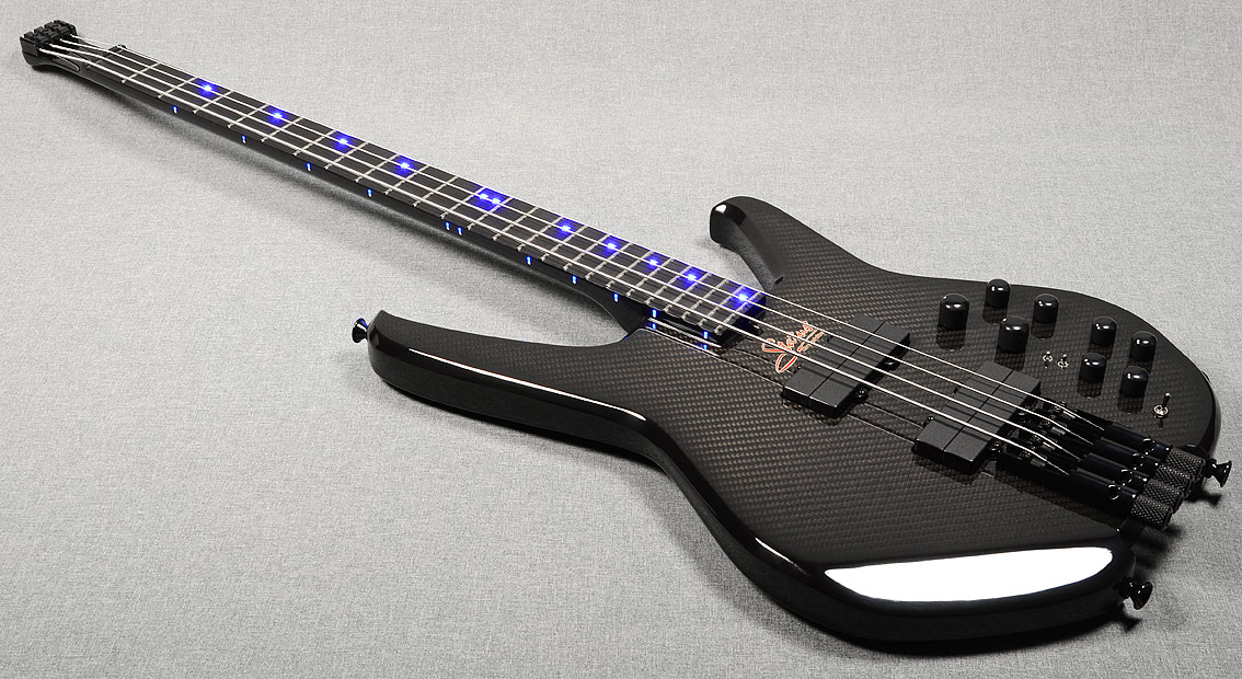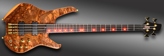 Lined fretless fingerboard with custom wrap-around green LEDs. |